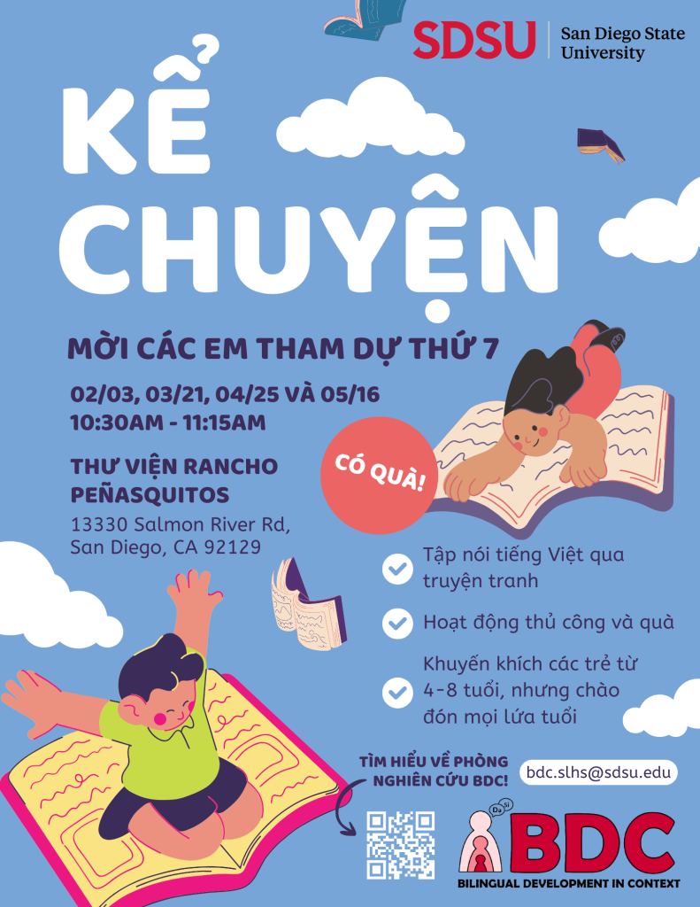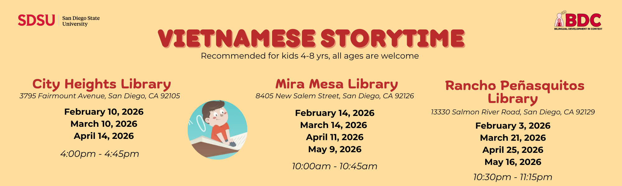Join The Bilingual Development in Context (BDC) Lab for Vietnamese Storytime! Children ages 4-8 will have the opportunity to listen to a story in Vietnamese and in English from our incredible research assistants. Each storytime is followed by fun interactive activities such as role playing and arts and crafts.